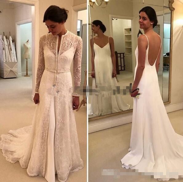 2019 Winter Outdoor Wedding Dresses With Long Lace Jacket Wrap Two Pieces Stain Sweep Train Garden Church Elegant Bridal Wedding Gown Unusual Wedding