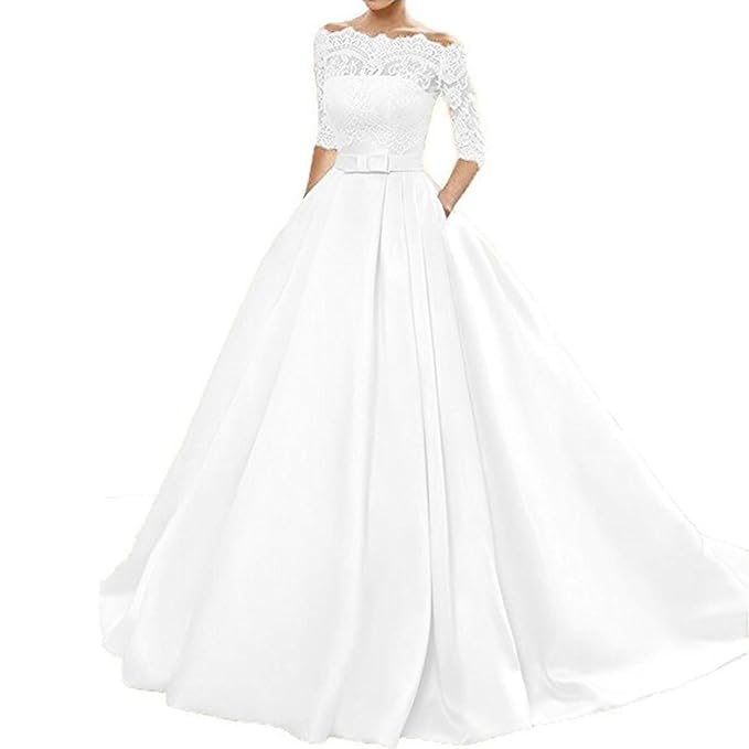 Onlinedress Women S Lace Wedding Dress 3 4 Sleeves Sweep Train Satin Bridal Gown