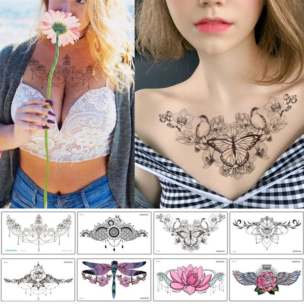 Chest Tattoo Design Fake Lotus Flower Dragonfly Jewelry Necklace Angel Butterfly Decal For Woman Temporary Body Waist Art Tattoo Sticker New Temporary
